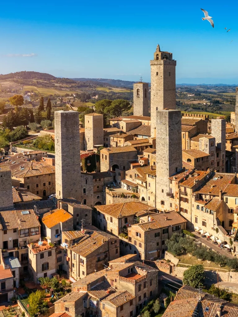 Το πρώτο πράγμα που πρέπει να απολαύσεις στο έπακρο όταν φτάσεις είναι φυσικά οι Πύργοι της περιοχής που είναι 14 τον αριθμό! Η “Κολετζάτα” (Collegiata di Santa Maria Assunta) και ο καθεδρικός ναός της πόλης (Duomo di San Gimignano), μαζί με την εκκλησία του Αγίου Αυγουστίνου (Chiesa di Sant’ Agostino) είναι τα top μνημεία-αξιοθέατα που θα δούμε. Όταν πας στο Σαν Τζιμινιάνο επισκέψου τις τέσσερις πλατείες του την Πιάτσα ντελά Κιστέρνα (Piazza della Cisterna), την Πιάτσα Ντουόμο (Piazza del Duomo), την Πιάτσα Πεκόρι (Piazza Luigi Pecori) και την Πιάτσα ντέλε Έρμπε (Piazza delle Erbe). Εννοείται πως δεν παραλείπεις να ανέβεις στην κορυφή του ψηλότερου πύργου Torre Grossa. Τέλος δοκίμασε σίγουρα το εξαιρετικό παγωτό τους. Στην Πιάτσα ντελά Κιστέρνα υπάρχει το πιο γνωστό παγωτατζίδικο του κόσμου το Gelateria Dondoli.