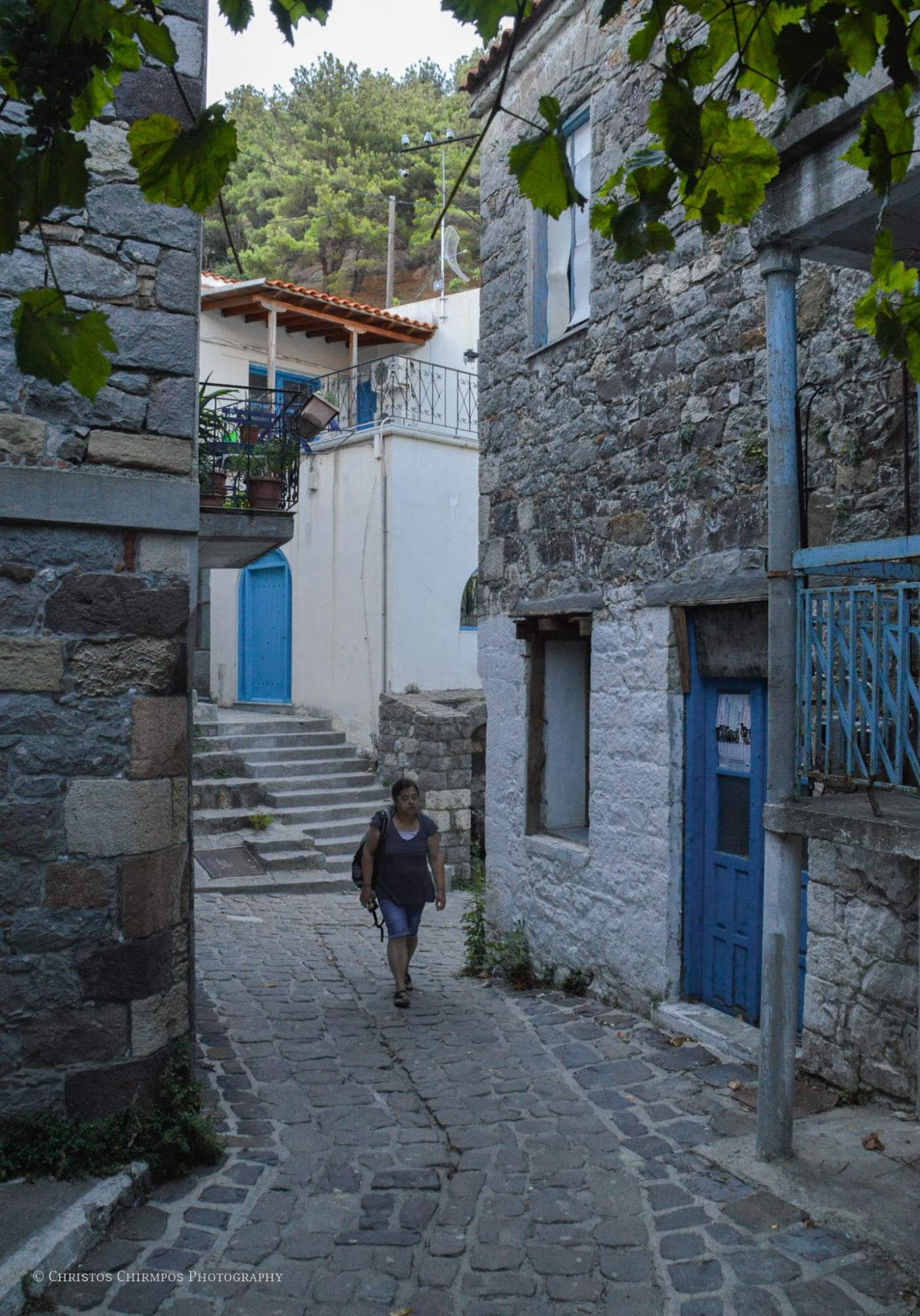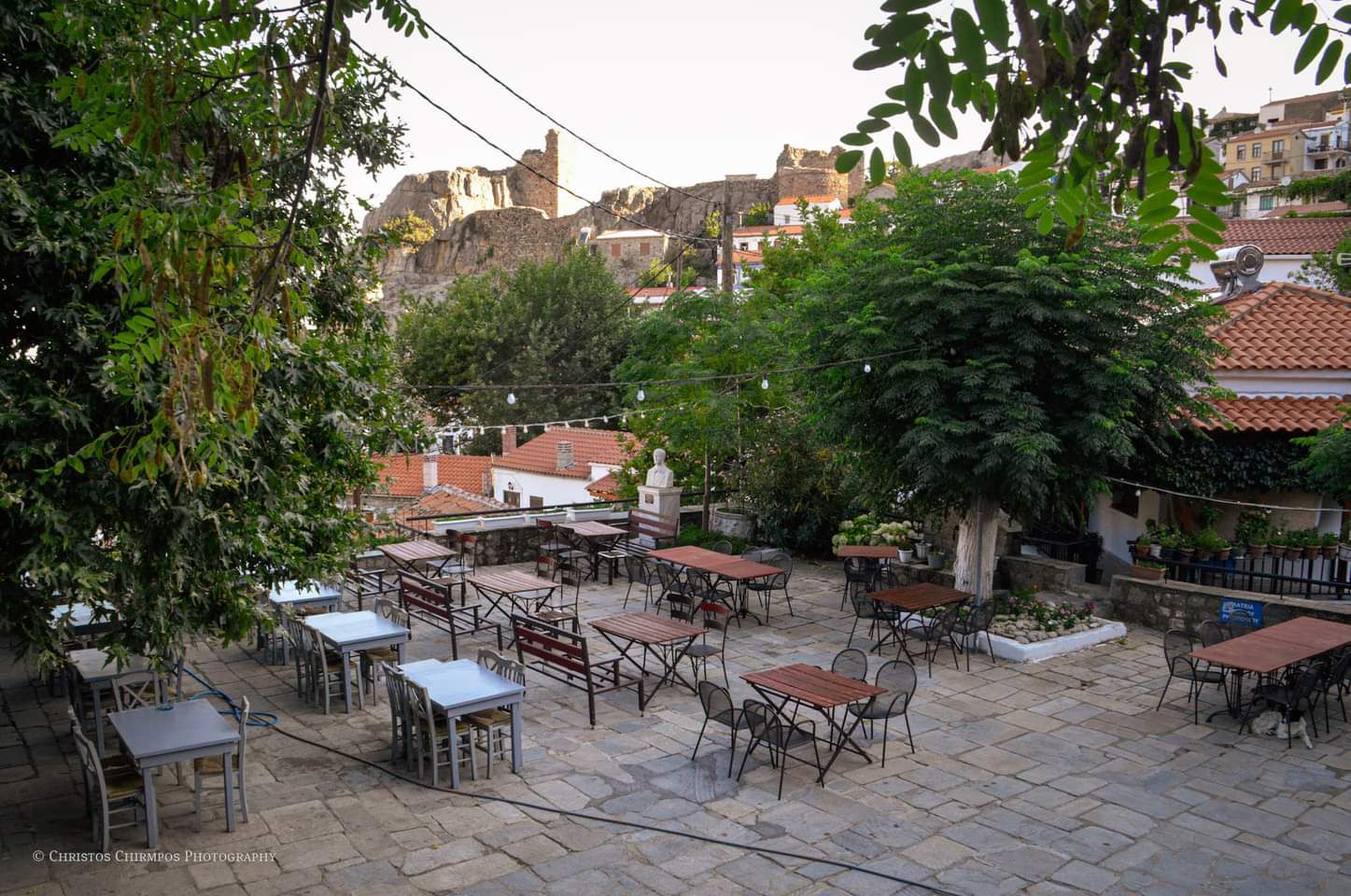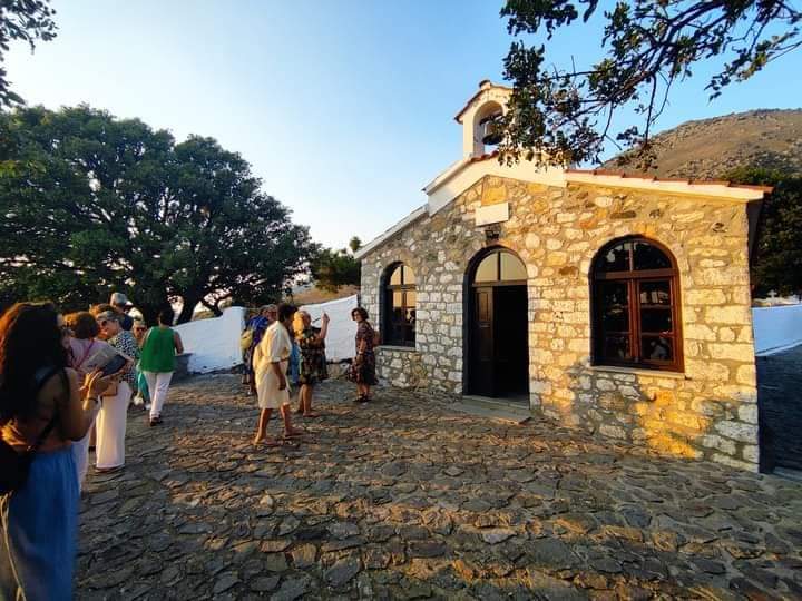 Πρωινό και επισκεπτόμαστε τη χώρα που βρίσκεται σε μια πλαγιά του όρους Σάος αμφιθεατρικά χτισμένη ώστε να μην είναι ορατή από τη θάλασσα και τους πειρατές. Βόλτα στα γραφικά στενάκια, επίσκεψη στο Γενουάτικο κάστρο των Γκατελούζι. Καφέ και παραδοσιακά γλυκά στα μαγαζιά του χωριού, τοπικά σουβενίρ και γλυκά του κουταλιού. Μην παραλείψετε να δοκιμάσετε «Πίσσα και πούπουλα» κάτω από τον ίσκιο του πλάτανου στο κέντρο της Χώρας.
