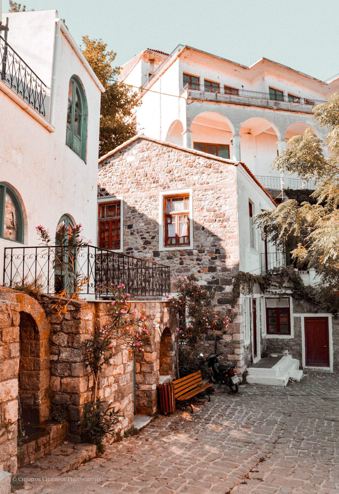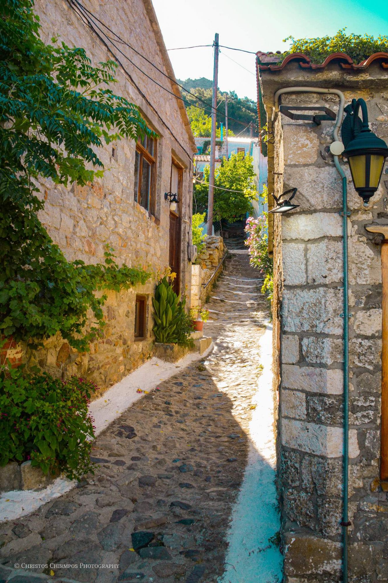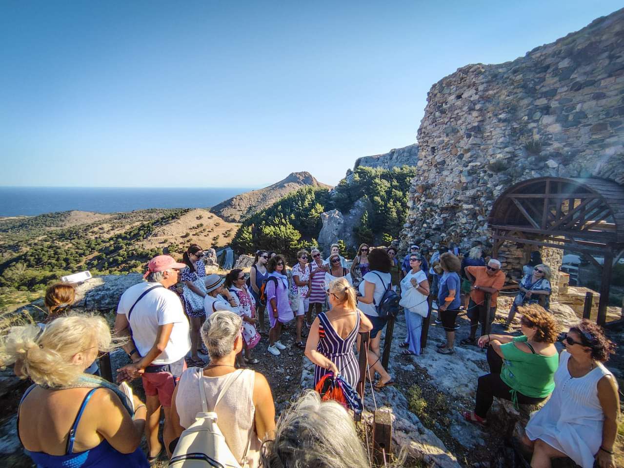 Πρωινό και επισκεπτόμαστε τη χώρα που βρίσκεται σε μια πλαγιά του όρους Σάος αμφιθεατρικά χτισμένη ώστε να μην είναι ορατή από τη θάλασσα και τους πειρατές. Βόλτα στα γραφικά στενάκια, επίσκεψη στο Γενουάτικο κάστρο των Γκατελούζι. Καφέ και παραδοσιακά γλυκά στα μαγαζιά του χωριού, τοπικά σουβενίρ και γλυκά του κουταλιού. Μην παραλείψετε να δοκιμάσετε «Πίσσα και πούπουλα» κάτω από τον ίσκιο του πλάτανου στο κέντρο της Χώρας.