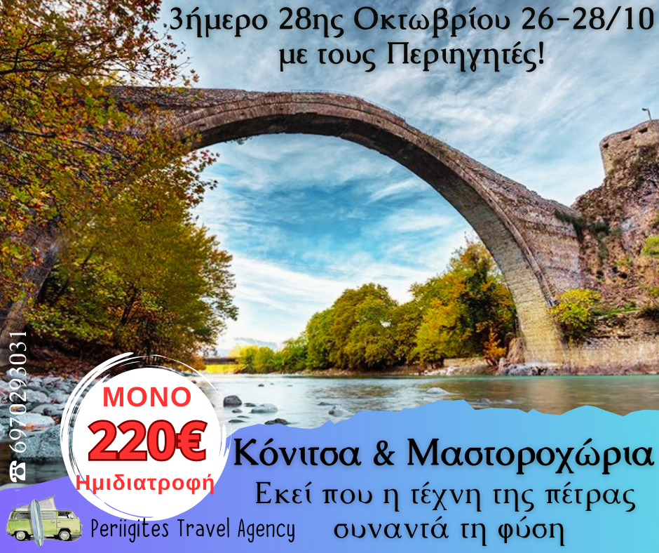 Αναχωρούμε από τα γνωστά σημεία (Πειραιά και Ομόνοια) νωρίς το πρωί. Μετά την απαραίτητη ενδιάμεση στάση για τον πρωινό μας καφέ, συνεχίζουμε για για την όμορφη Κόνιτσα!