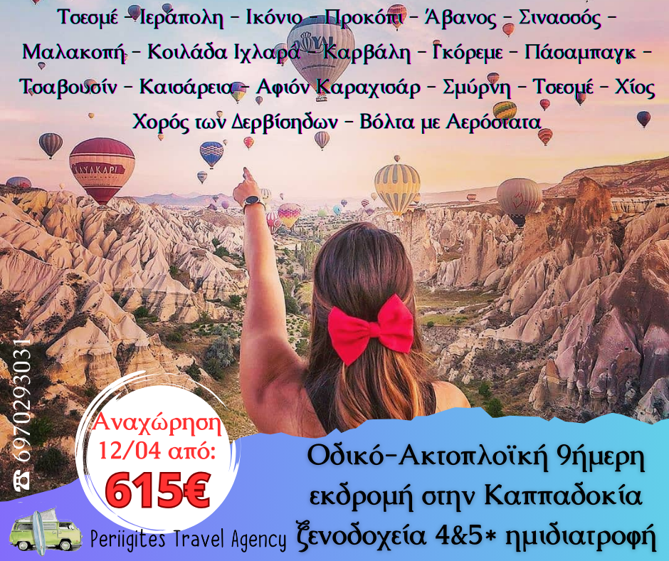 Υπάρχουν κάποια πράγματα στη ζωή που πρέπει να τα δεις. Ένα από αυτά, ειδικά αν είσαι Έλληνας, είναι η Καππαδοκία. Μέσα σε 7 ημέρες καλύπτουμε την Καππαδοκία και το μεγαλύτερο κομμάτι της Δυτικής Τουρκίας, με ένα στιβαρό πρόγραμμα περιηγήσεων, που καλύπτει όλα τα ενδιαφέροντα. Το ταξίδι μας αυτό αποτελεί ένα μοναδικό οδοιπορικό στα βάθη τηςΣυνέχεια ανάγνωσης «Από τη Μυροβόλο Χίο, στην Καππαδοκία. Τη «Χώρα των Όμορφων Αλόγων»»